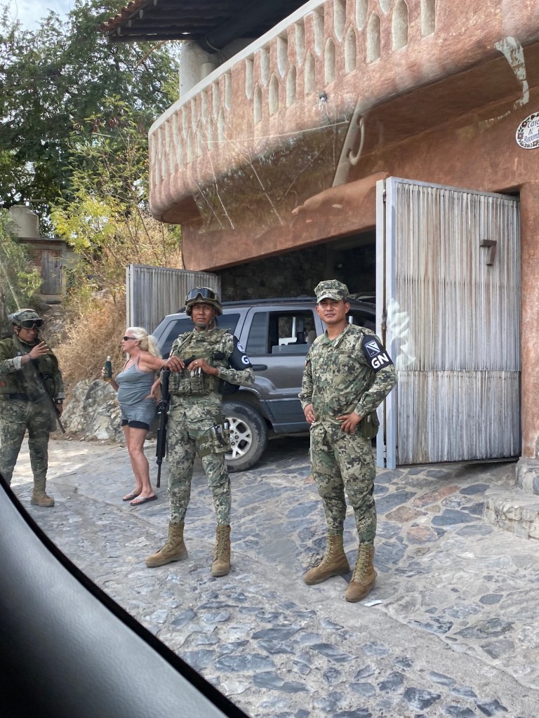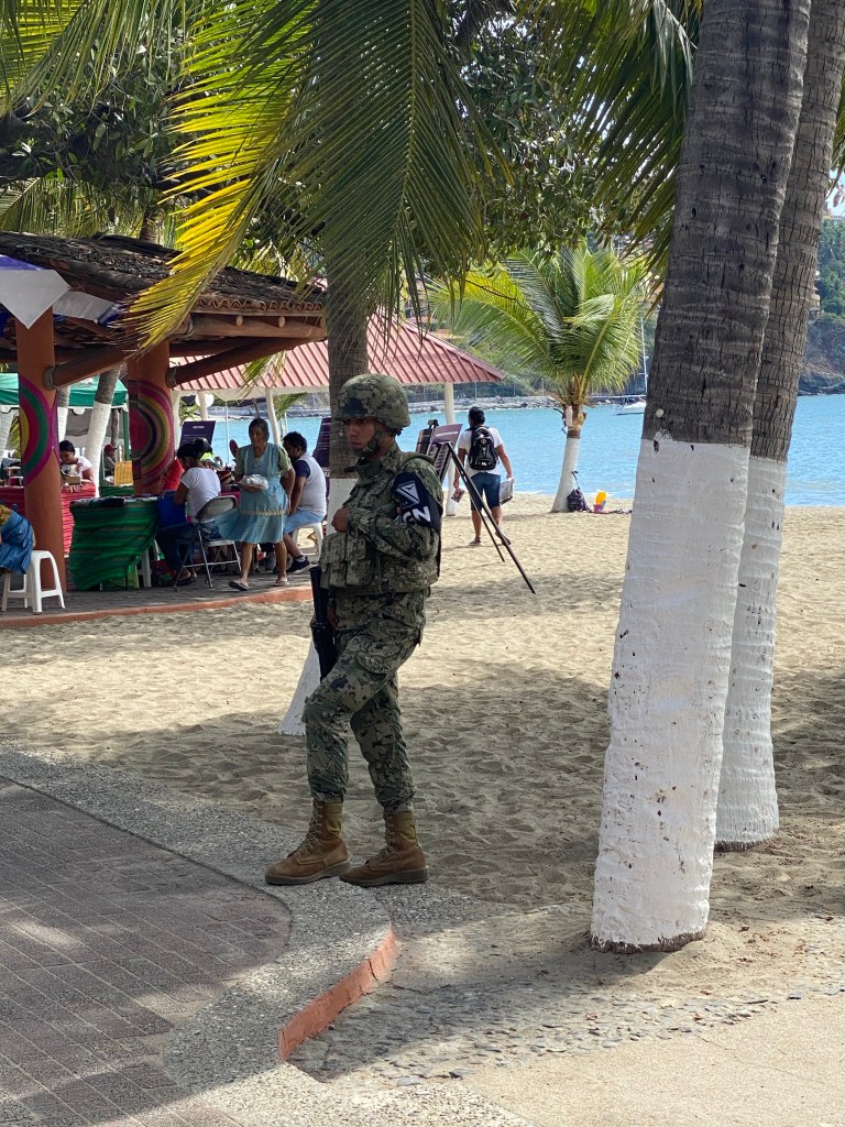 Welcoming us to Zihuatanejo…the military everywhere, rifles and all …..Supposedly it is a low crime area….