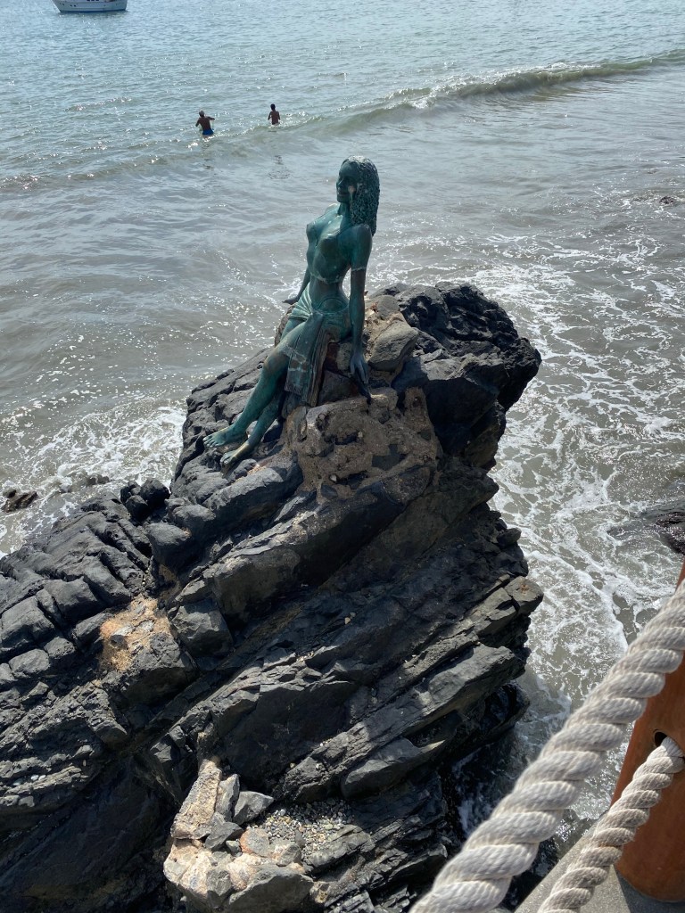 commemorating significant hero’s. Muriel “goddess of the sea” … I made up that name but I thought it sounds better then “some mermaid” is perched on a large rock in the bay.