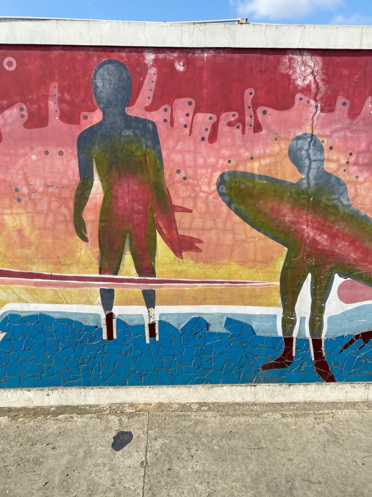 The area is also known for its beaches….-Colorful murals painted on concrete walls depict scenes and symbols of daily life