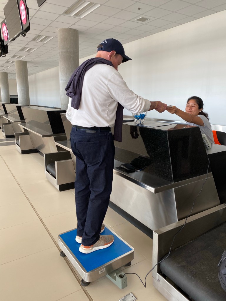 Now the important part …to get on the plane …we have to get weighed…not such a good feeling when you have been on a cruise ship for 18 days.