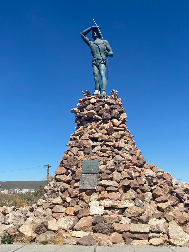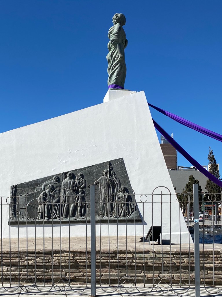 A Welch statue stands at Puerto Madryn commemorating 100 years of welch descendants….depicts a Welch women Looking inland “she sees a new starting point in her life”