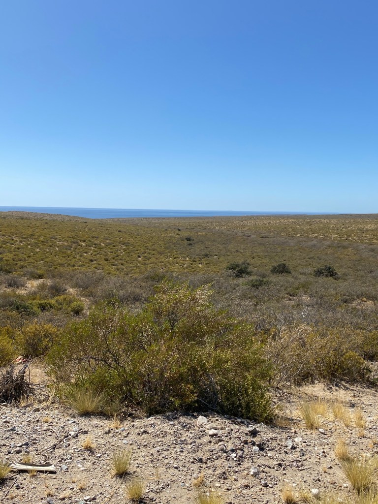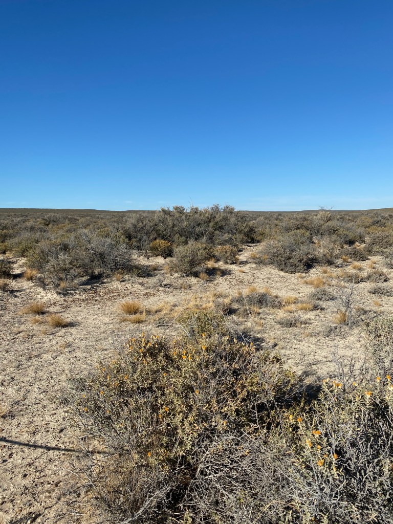 The desert is rocky with “scrubby”drought tolerant shrubs and plateaus…. plateau is a flat elevated plain. The weather is more extreme then other climates of Patagonia ….and it has almost no rainfall … 3/4” per year…..