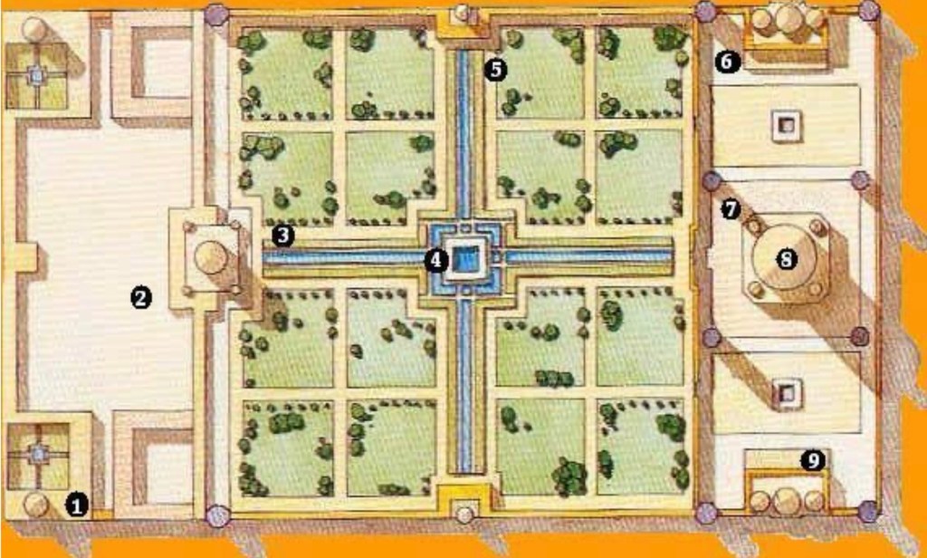It includes a mosque, guest house and formal gardens with three walls along a riverbank.