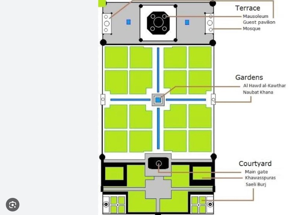 View from the mausoleum looking back to the main gate with inlaid patterns in the manicured lawns. ( Greenery was added during the Colonial period under the English influence. ).