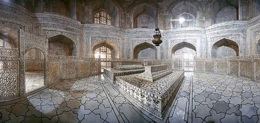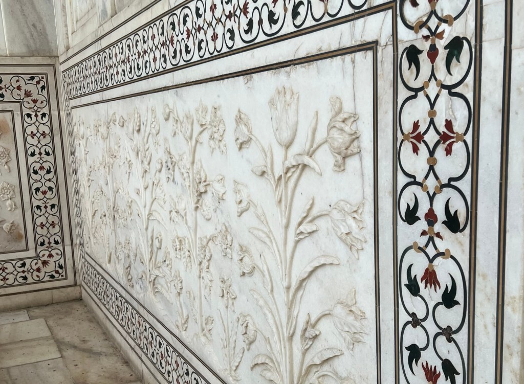 Marble was brought in from other areas in India as well as precious stones that were delicately cut … every piece of marble was painstakingly chiseled and every stone cut and inlaid by hand … covering all walls of the mosque including the dome.