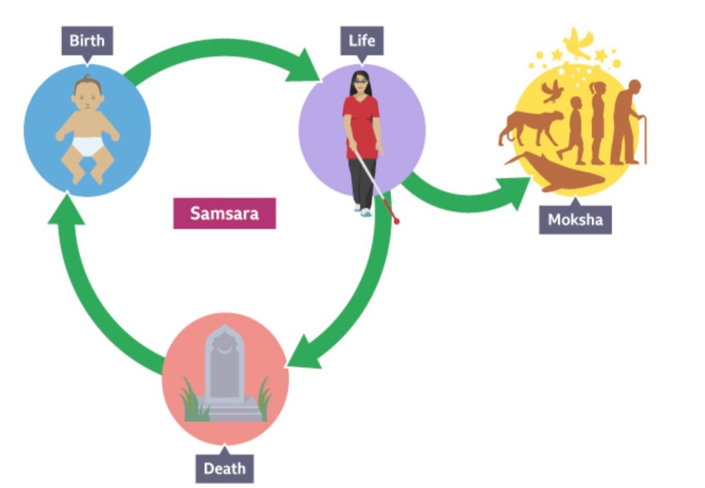 Hindus believe in a cycle of birth, life, death and rebirth. It is about the soul … the soul passes through a long cycle of existence occupying different bodies. They also believe in Karma ,,, Karma is basically “do good and good will come back to you in this life or the next” … that is necessary to elevate the soul. Hard work and respect to everyone is expected.
