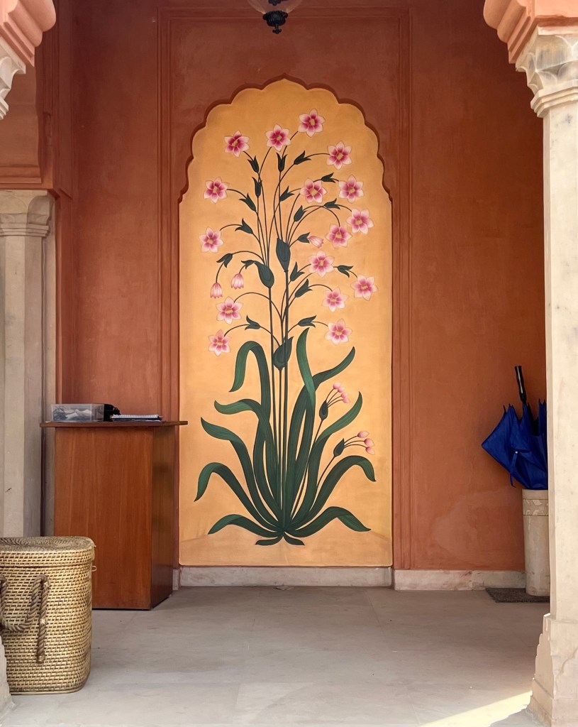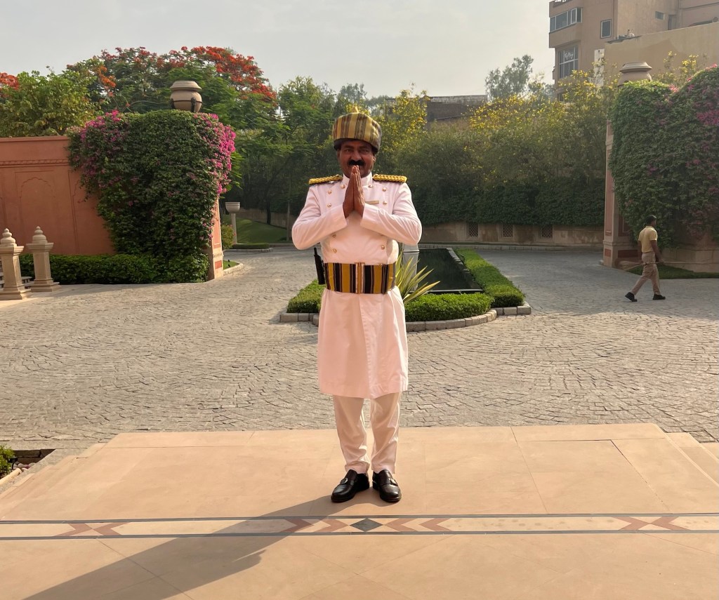 Namaste … our introduction to India. ( This pic is from a fancy hotel we stayed at but it is typical for someone to bow their head and fold their hands acknowledging you. )
