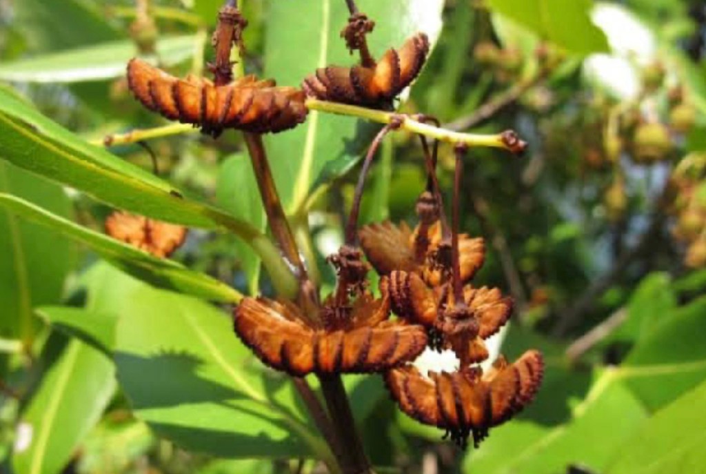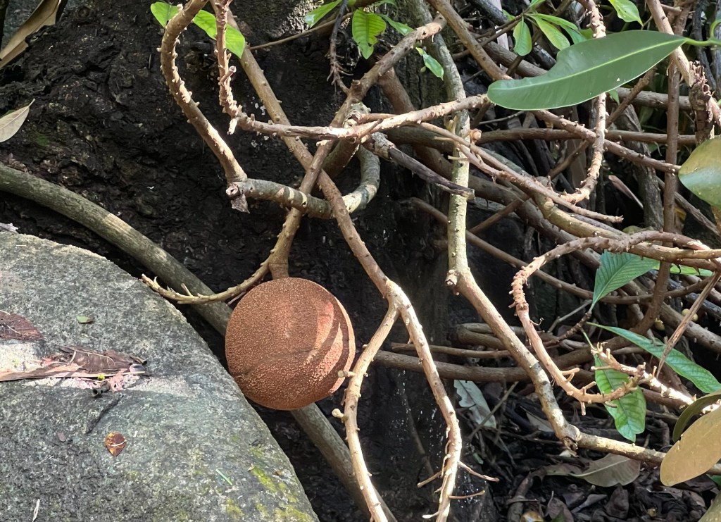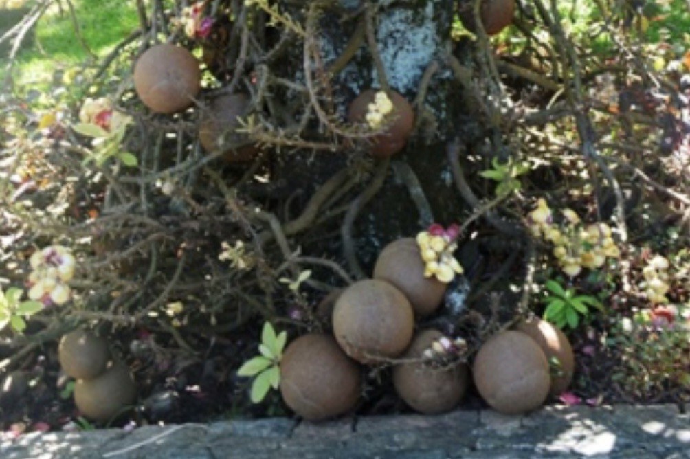 The Cannonball Tree grows up to 110’ and produces fruits that hang in clusters and look like rusty cannonballs.
