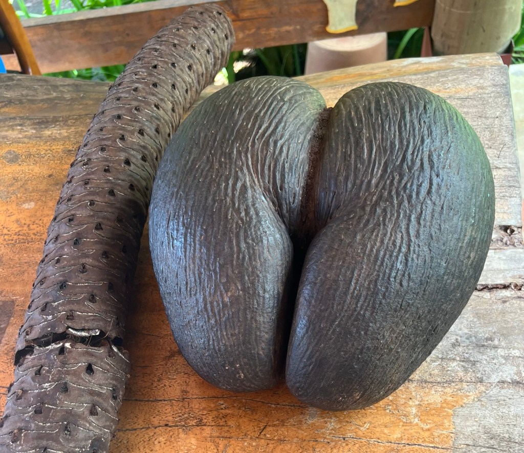 But their big CLAIM to FAME … “Coco de Mer” ( Sounds like a liquor )… the largest seed in the plant kingdom … a very rare species of Palm tree native to Seychelles. It is the national fruit of the country and the world’s heaviest seed … it can grow up to 40 lbs and take up to 10 years to ripen.